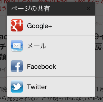 設定メニューから「ページの共有」を選択すると、Google+やメール、Facebookやツイッターにつぶやくことができます。