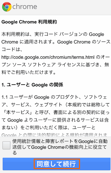iPhoneやiPadにChromeをインストールし、起動させるとまずは利用規則が表示されるので、「同意して続行」をタップします。