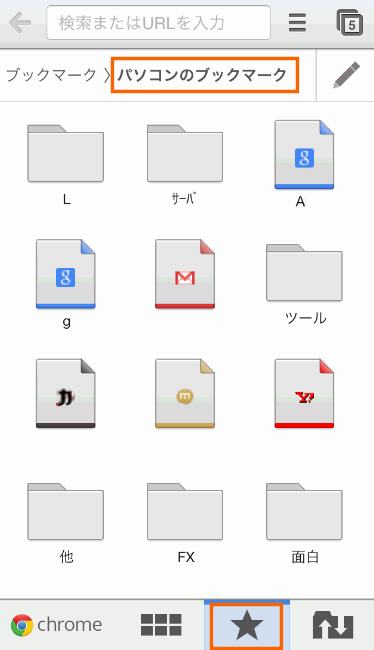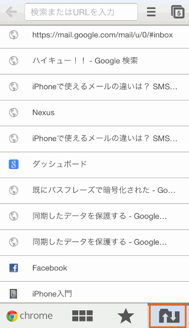 新しいタブを開いて画面下の「★」のマークのボタンをタップすると、iPhoneのChromeに登録したブックマークや、同じIDでログインしているパソコンのブックマークにアクセスすることができます。