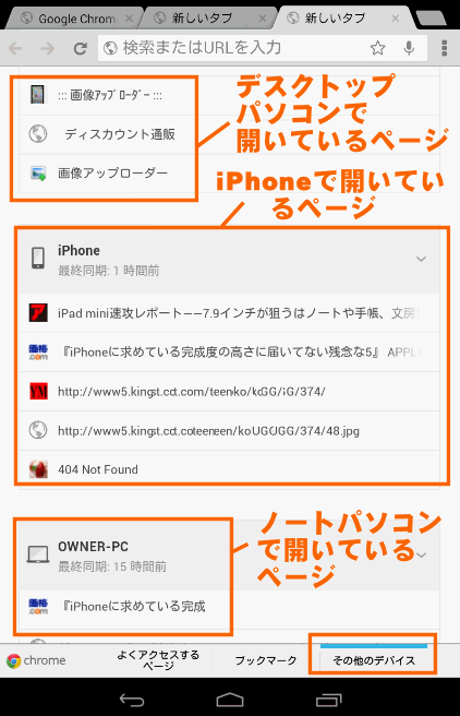 パソコンやiPad、AndroidのChromeで開いているタブをiPhoneで見ることもできちゃいます。