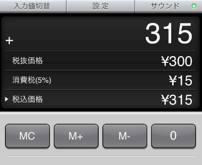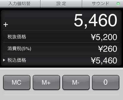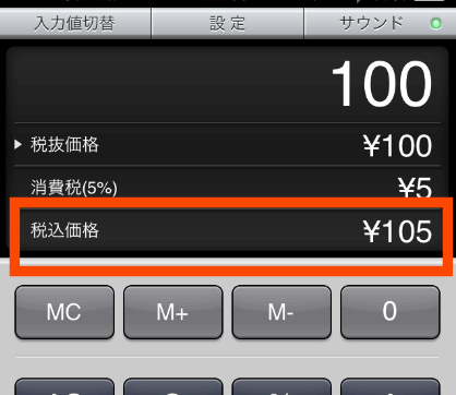 例えば、税率5%で「税抜き」設定にした状態で「 100 」と入力すると、即座に「税込価格」に105と表示されました。