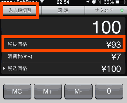 今度は、100と入力された状態で「入力値切替」をタップすると、今度は税率8%で税込みで100円の状態に切り替わり、「税抜価格」に93円が表示されました。