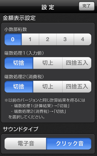 画面上部中央の「設定」をタップすると、税率を変更したり、ボタンをタップした時の音を変更したり、小数点の有り無し、切り捨てか切り上げかなどを設定できます。