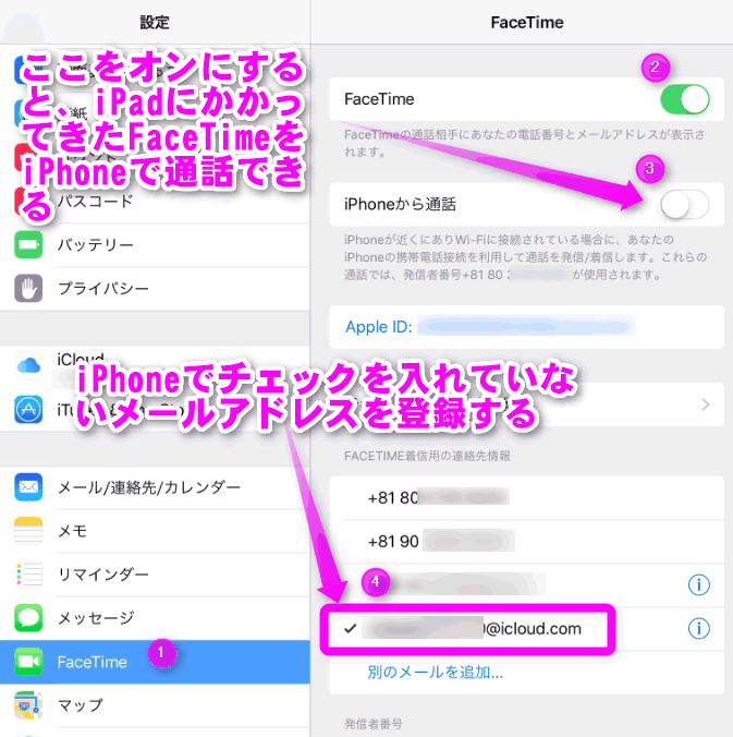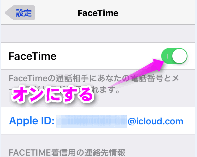 設定の「FaceTime」の項目を開くと、下の方に「FACETIME着信用の連絡先情報」の部分に、幾つかの電話番号と、メールアドレスが表示されていて、デフォルトですべての電話番号・メールアドレスにチェックが付いていると思います。