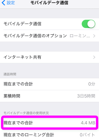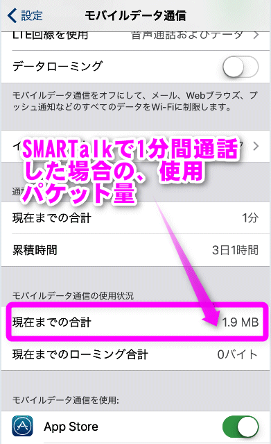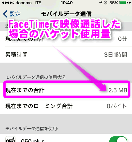 携帯電話回線を使って1分間、FaceTimeの映像通話をした時のパケット使用量は、なんと2.5MB/分でした。