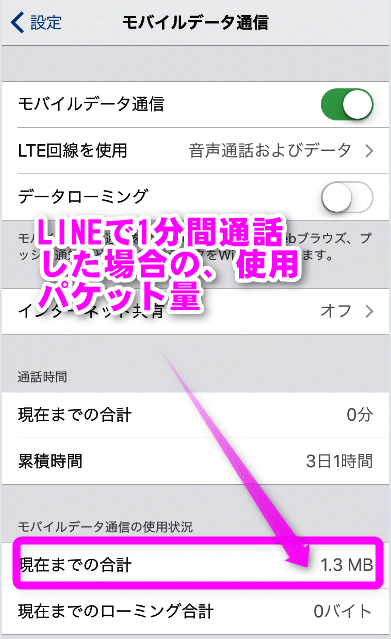 続いてLINE同士で1分間通話した場合の、使用したパケット量で、約1.3MBでした。