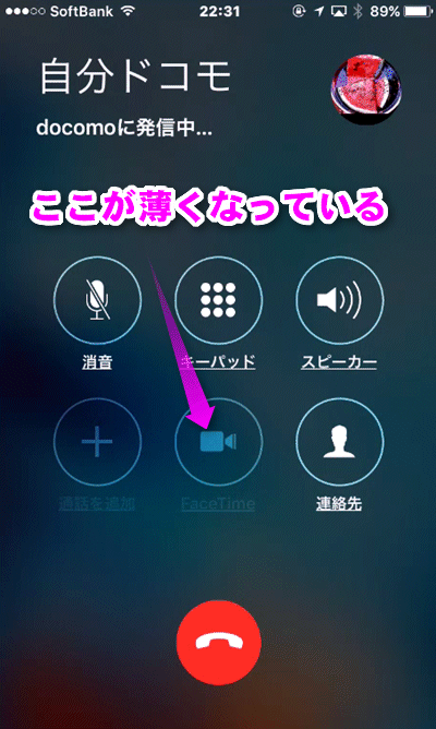 「FaceTime」のボタンが薄くなってタップできないようになっています。