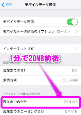 1分間のパケット使用量は、22.4MB(実際には1分10秒ぐらい)でした。だいたい1分間で20MBほどのパケットを使用するようです。