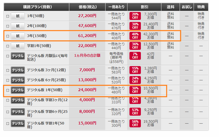 デジタル版だと1年間の購読で、1冊あたり480円と30%オフ。