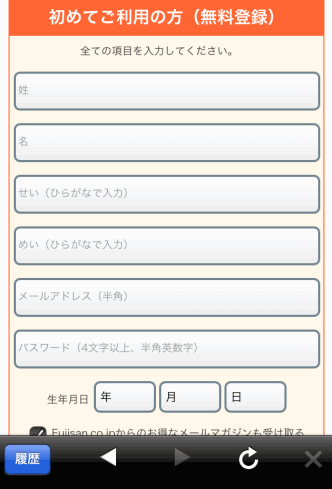 名前、フリガナ、メールアドレス、パスワード(ログイン用)、生年月日(パスワードを忘れた時用)を入力します。