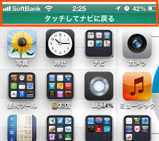 で、iPhoneのマップの優れている点は、ナビの途中で別のアプリを立ち上げて再びナビに戻る時、画面の上部にナビに戻るためのタップするスペースが標示されること。