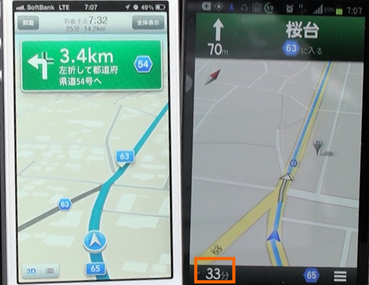 ナビゲーション時の地図の綺麗さは、iPhoneのほうが上手。