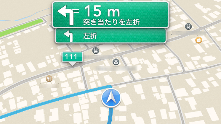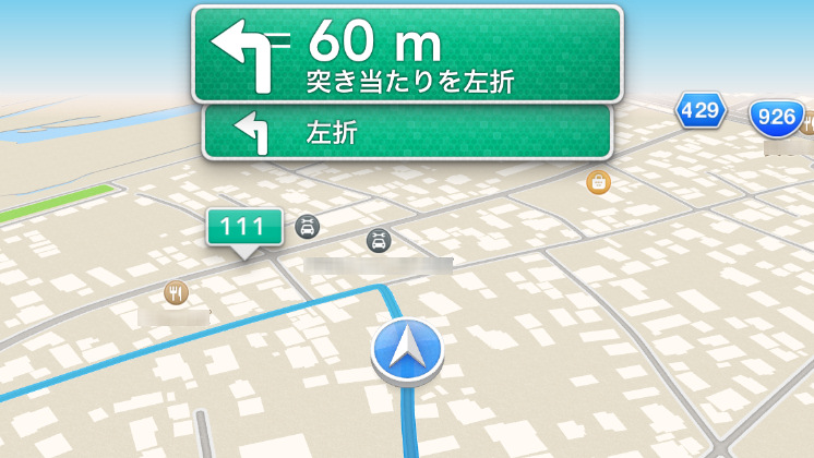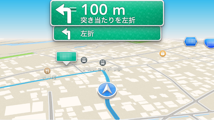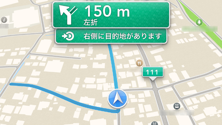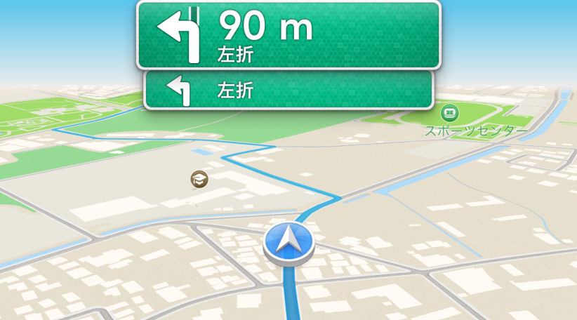 普通のカーナビは、1秒間に1回ずつほどマップが書き換わりますが、iPhoneやgoogeleのナビはヌルヌルのスムーズさ。