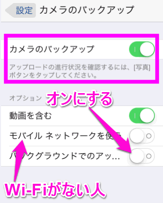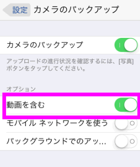 先ほどの画面で、カメラのバックアップを有効にしなかった場合は、後から有効にすることもできるし、逆にオフにすることもできます。