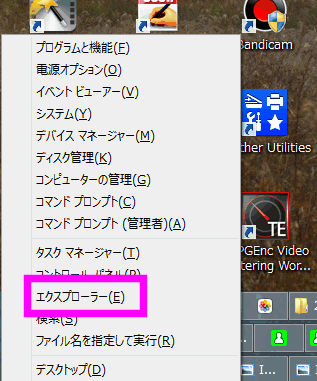 Windowsキー」と「Xキー」を同時に押すと、画面の左下からこのようなメニューが表示されるので、「エクスプローラー」をクリックします。