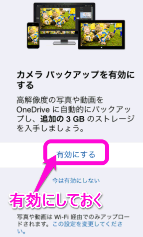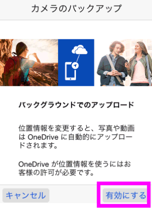 うまくログイン出来ると、「カメラバックアップを有効にする」という画面になるので、「有効にする」をタップします。