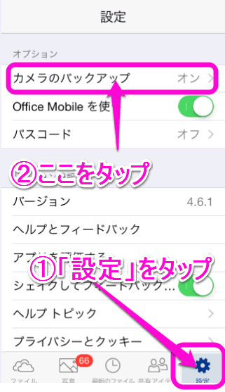 その場合は、①画面右下の「設定」をタップし、②「カメラのバックアップ」をタップします。