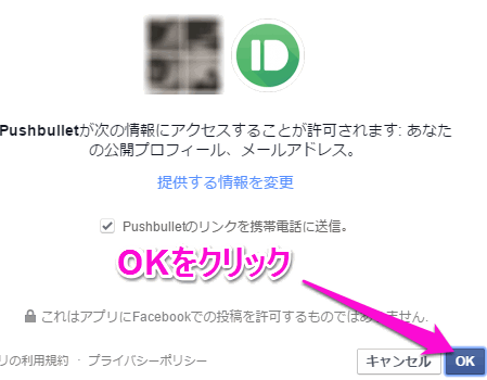 PushbulletがFacebookの一部の情報にアクセスしていいか確認してくるので、「OK」をクリックします。