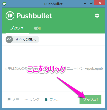 今回はEPUBファイルを送ってみます。右下の「プッシュ」をクリック。