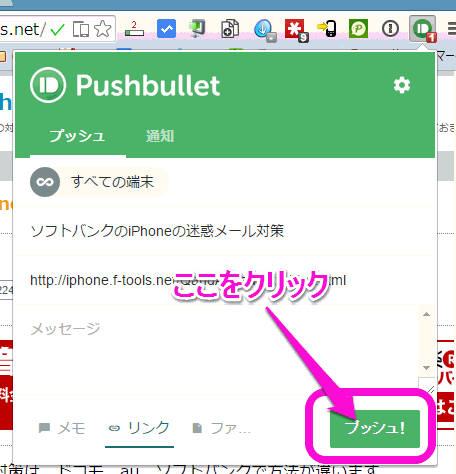 URLを送った時と同じように、Chromeの右上のPushbulletのボタンをクリックし、