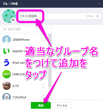 上の入力欄にわかりやすいグループ名を入力します(例えば「テキスト送信用」など)。