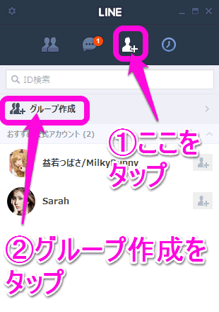 まずは、パソコン版のLINE(スマートフォンのLINEでも構いませんが)の①の友だち追加の部分をタップします。