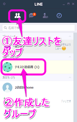 ①友だちリストをタップすると、②今作成したグループが表示されました。