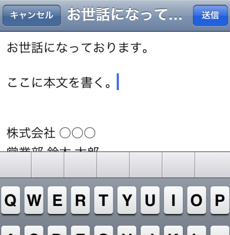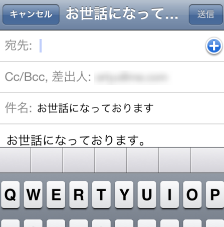 今度は、自動的にiPhone標準の「メール」アプリが立ち上がり、SpeedMailerで保存した定型文が入力された状態になっています。