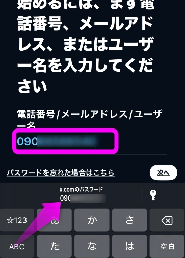 Xに登録してある電話番号(かメールアドレス、もしくはユーザー名)を入力し、②の「次へ」をタップします。