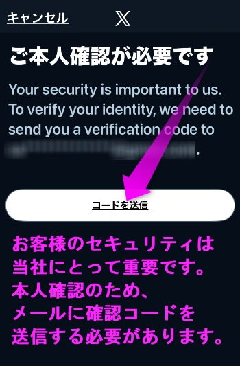 本人確認のために、登録してあるメールアドレスに確認コードを送信します。