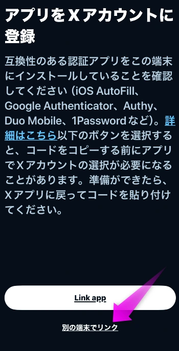 「アプリをXアカウントに登録」の画面では、「別の端末でリンク」をタップしてください。
