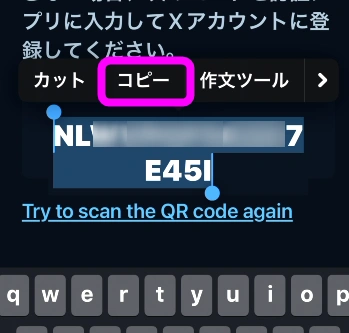もし「コピー」が表示されない場合は、この英数字を紙などに書き写してください。