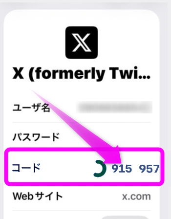 パスワードの下にある「コード」の横の表示されている6桁の数字をタップすると、「コピー」という吹き出しが出てくるので、タップ。