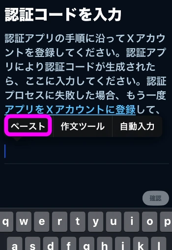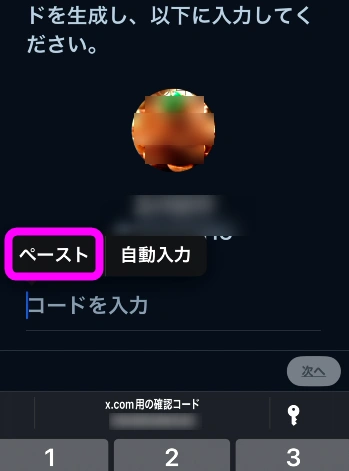 コピーした6桁の認証コードを「ペースト(貼り付ける)」します。