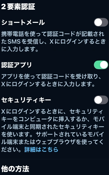 もう一個、「セキュリティキー」という方法もあるのですが、こちらは2台のスマートフォンがないと出来ないっぽいので、ちょっと敷居が高いです。