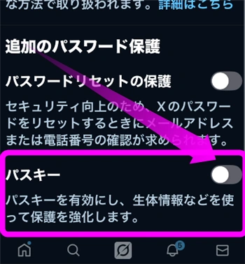 一番下に「パスキー」という項目があるので、ここをタップしてオンにします。