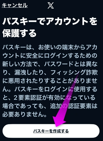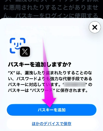 画面の下からこのようなダイアログが表示されるので、「パスキーを追加」をタップします。