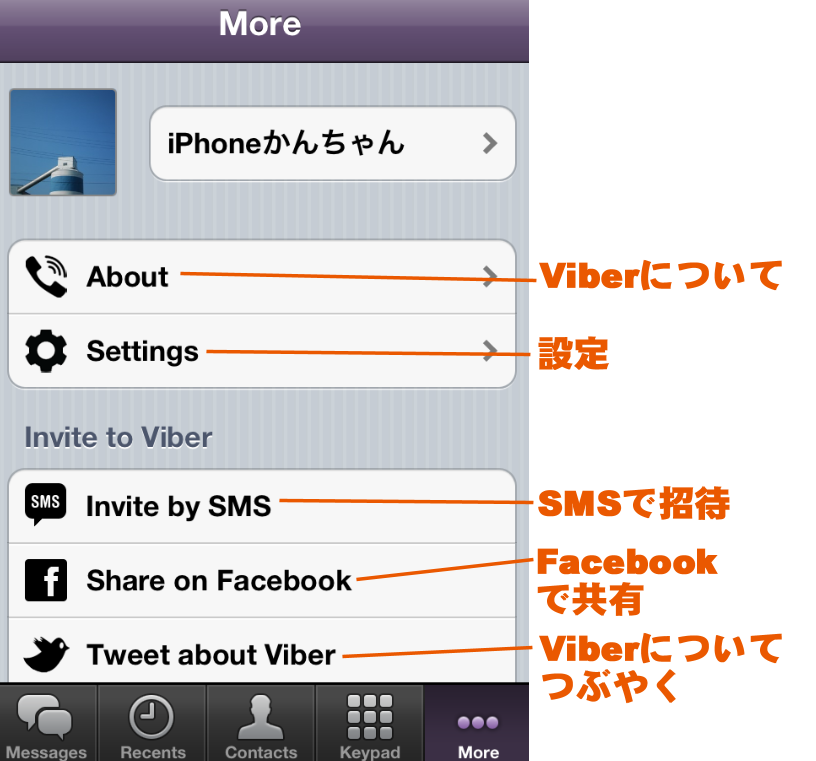 Settingは、Viberの設定ができます。これについては下で解説しています。