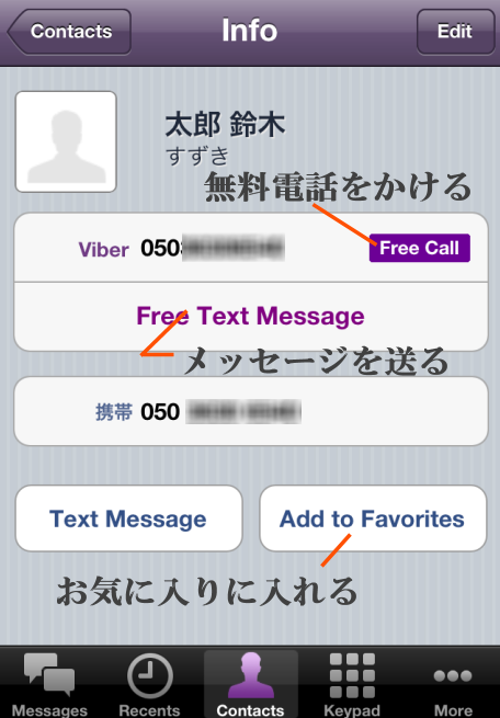 連絡帳では、iPhoneに登録しているすべての連絡先を見ることができますが、相手がViberをインストールしていない場合は、普通の携帯電話から通話します。