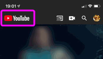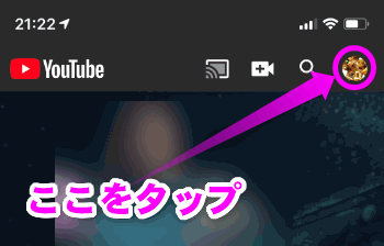 YouTubeにサインインした状態だと、画面の右上に丸の自分のアイコンが表示されるので、ここをタップします。
