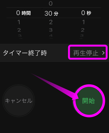 「タイマー終了時」のところが「再生停止」になっていることを確認したら、「開始」をタップします。