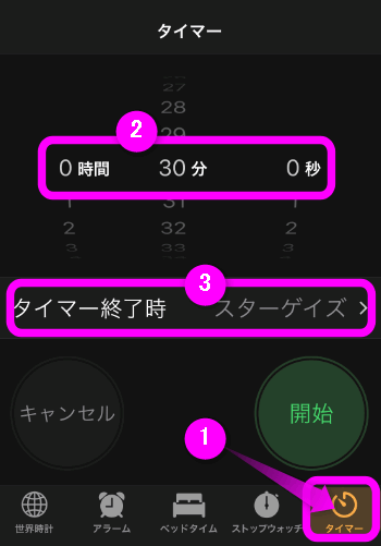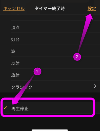 右下の「タイマー」を選択し、②何分後(もしくは何時間後)に再生をストップするか設定します。