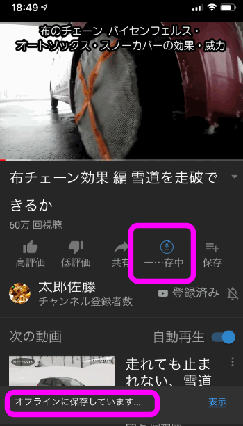 適当な動画を表示させたら、「オフライン」と記載されたアイコン(画像の丸で囲った部分)をタップします。