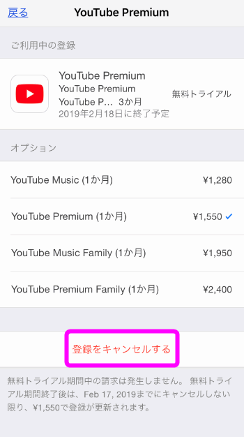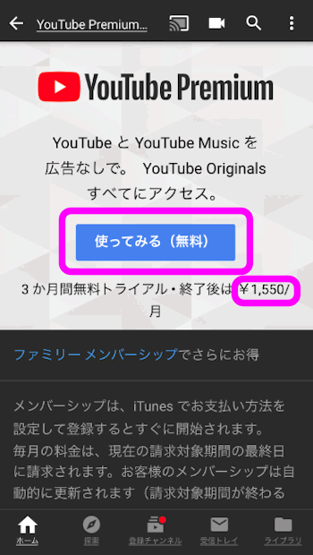 YouTube Premiumは、iPhoneユーザーかそうでないかで実は料金が違います。iPhoneの場合、Appleへの手数料分が加わるようで、月々1,550円です。