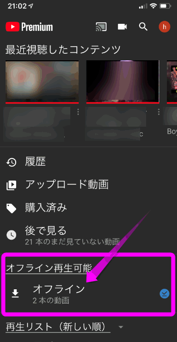 この「オフライン再生可能」の下の「オフライン」をタップします。