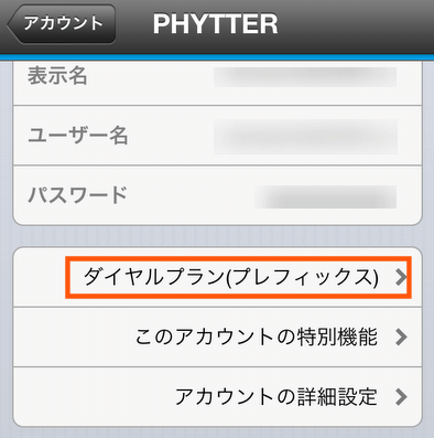 先ほどのアカウント(「設定」→「アカウント」→「有効なアカウントに登録されたアカウント」)の画面で、「ダイヤルプラン(プレフィックス)」と言う項目があるので、タップします。
