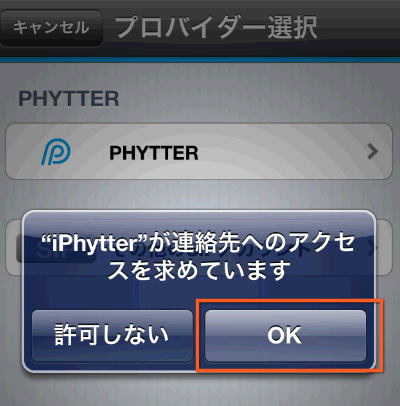 起動するとiPhoneの連絡先(電話帳のこと)にアクセスしていいか聞いてくるので、OKをタップします。