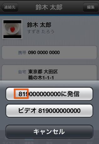 これで、連絡先の番号をタップすると、このように「0」が「81」に置き換わって電話してくれます。