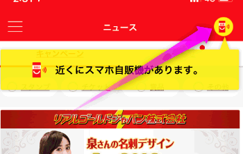 対応している自動販売機が近くにあると、アプリの上のほうに「近くにスマホ自販機があります」と表示されます。