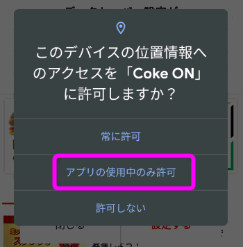 位置情報の仕様の許可を求めてきます。「アプリの使用中のみ許可」をタップします。なお、許可しないをタップしてしまうと、Coke ON Payが使えなくなる可能性があるので注意。